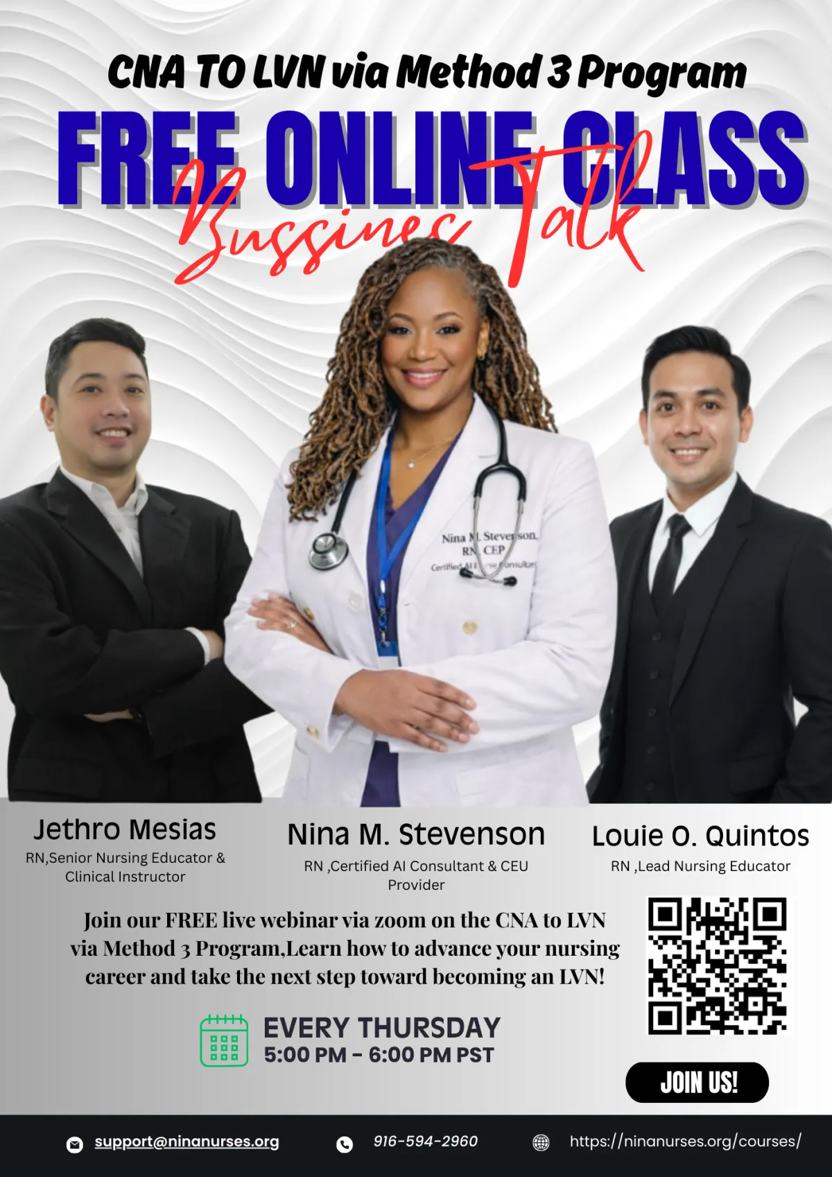 Join our FREE live webinar via zoom on the CNA to LVN via Method 3 Program. Learn how to advance your nursing career and take the next step toward becoming an LVN!